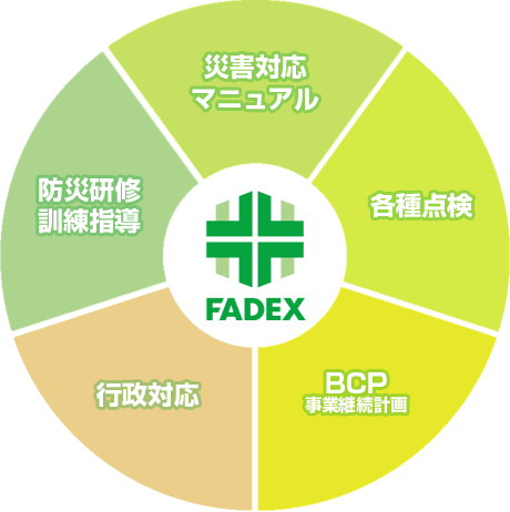 弊社ではそのような「安全に対する取り組み」の死角となる箇所を全て洗い出し、基本となる防災対策の立案をもとに、日頃からの防災力を高める「研修・訓練」、災害 発生時に慌てることなく対応できることを考えた「災害対応マニュアルの作成」、また「行政対応」によって側面からの応援を行い、備えとして「各種点検」を適正に実施、さらに被災からの早期復旧のための「BCP(事業継続計画)」の策定といった5つの事業を事業の柱として取り組み、業態に合わせた防災コンサルティングを行っております。